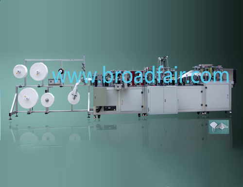 此机器为全自动折叠口罩生产线,从多层原材料布料卷入料、鼻线熔接、耳带熔接及Logo印刷全部工艺均为一条线全自动化作业,省工省时。